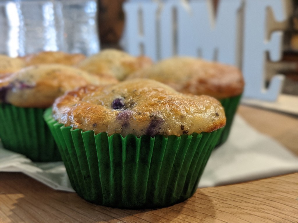 Combine flour with chia seed, protein powder, baking soda, and salt. Set aside for now. In a separate bowl, mix together sugar, avocado oil, and egg until combined. Alternate adding milk and dry ingredients until all combined. Zest lemon into batter and then juice of lemon. Mix and add blueberries (more blueberries if you’re anything like me).