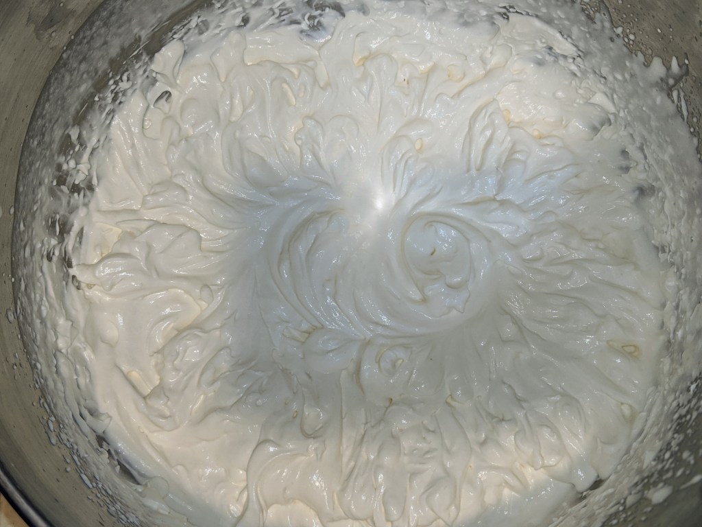 In a clean bowl, whip the heavy whipping cream with powder sugar and vanilla until a thick, peaked cream is formed.