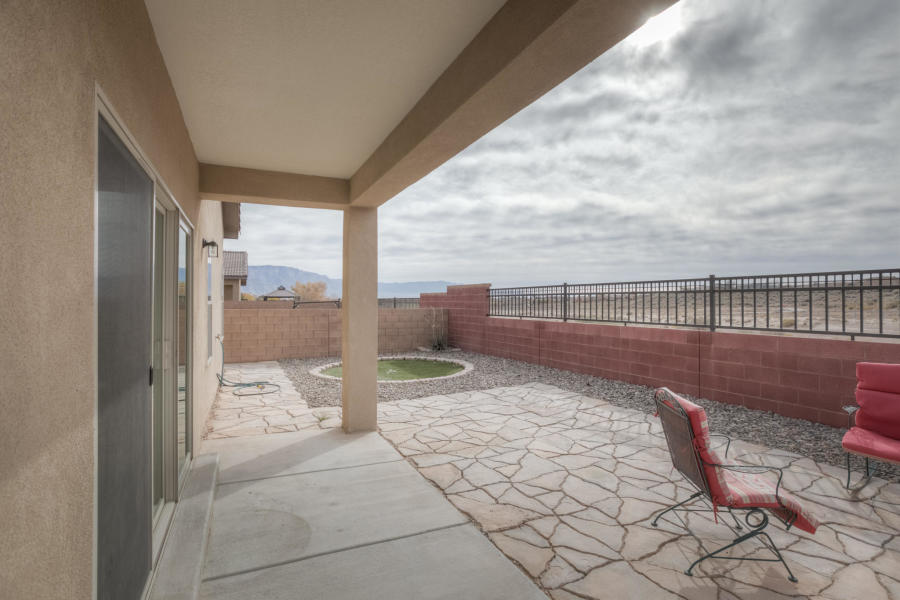 The backyard to this lovely Loma Colorado home backs up to an arroyo. What does that mean? No neighbors behind you! The backyard is efficient like the home itself. A mix of low maintenance xeriscaping and AstroTurf grass. It also comes with a covered patio–perfect for hanging outside during all seasons. My favorite? The views of the Sandias!