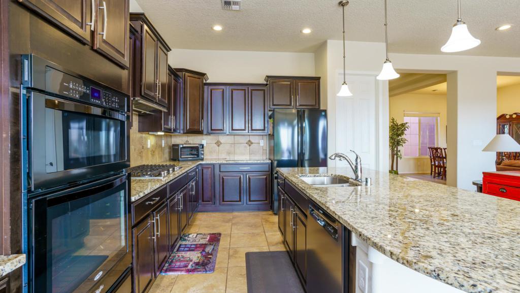 I almost always have to talk about kitchens. This home has the classic, modern open feel. A large granite island looks out to the living and dining areas. There is so much storage. Not only in the cabinetry (surrounding the kitchen and within the island), but also a DEEP pantry that feels like a small grocery story. Dark wood and natural sandy hues in the granite give this home a classic, modern feel.