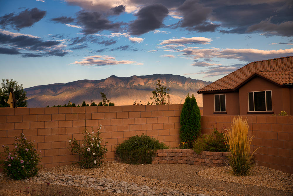 The house is full of bright light and big windows. One of the best views is outside. The backyard is landscaped and desert living ready with a xeriscaped lawn. Lots of native plants and even a covered patio make it ready for entertaining (or quarantining). Included as well, a magnificent view of the Sandia mountain range. I’m sure it looks great on a snowy day or with a thunderstorm rolling in.