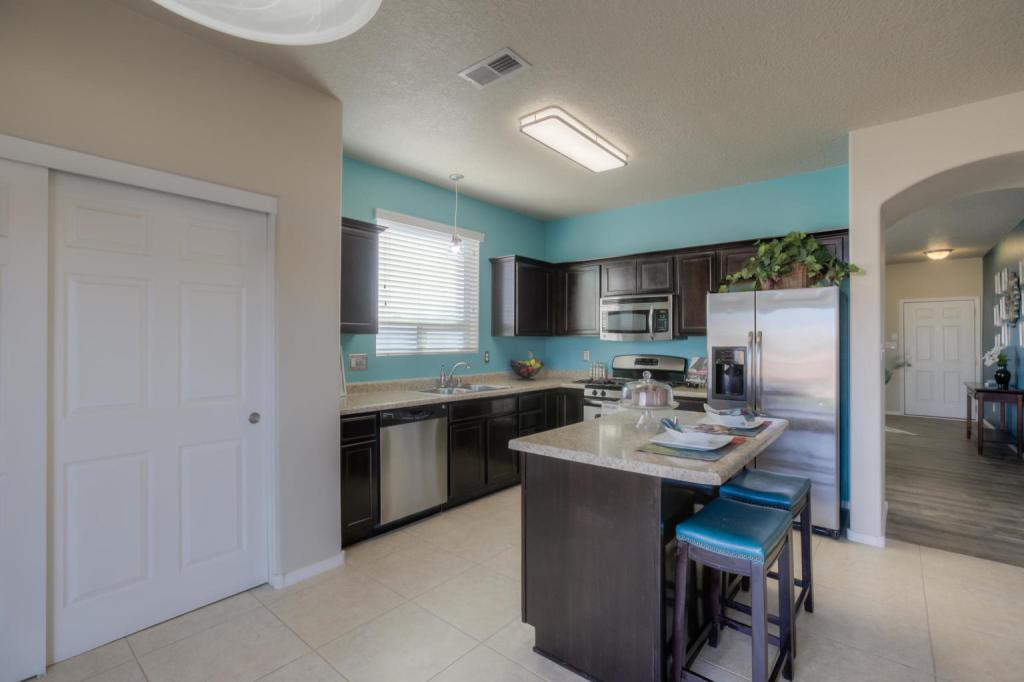 Located on the first floor (like many kitchens), the open floor plan moves you from the front living and dining space into the kitchen and main living room. The kitchen has great views of the Sandias from the sink window, stainless steel appliances, and a lovely granite island that is great for prep work and additional seating. This great kitchen also includes a large pantry and an open view of the main living area. You can watch your favorite show and cook at the same time.