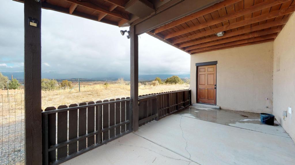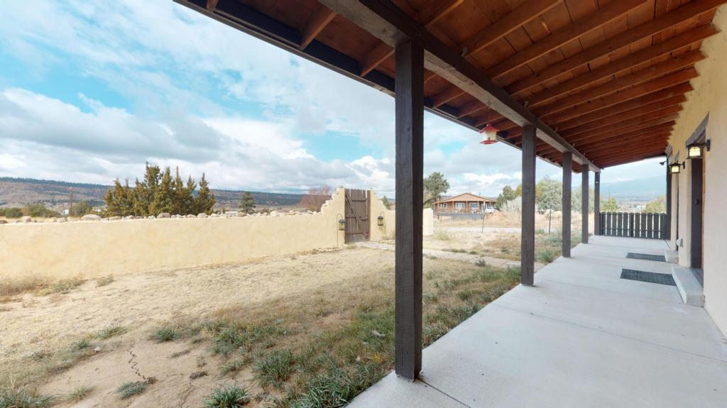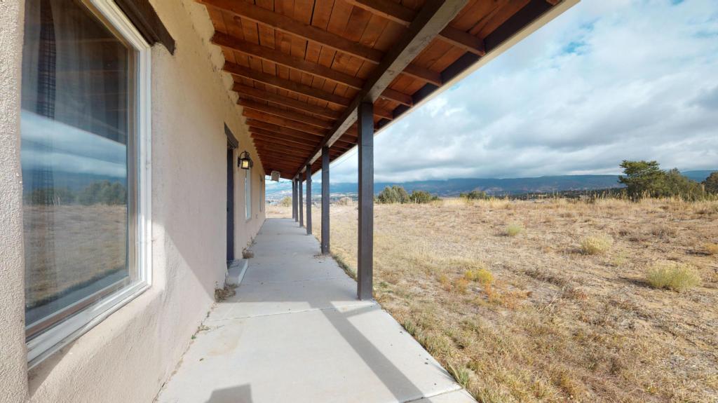 When you first drive up to the home, you are greeted with a lovely adobe wall leading into the main front courtyard. It offers a sense of privacy and classic Pueblo/New Mexican touch. Not only do you get this gorgeous front porch. It stretches the length of the front home. I can imagine some rocking chairs or a porch swing. Some place to take a load off and enjoy the view that surrounds the home. The porch and patio doesn’t wrap around back, but you do have another long porch at the back of the home. Offering more opportunities for entertainment or relaxation.