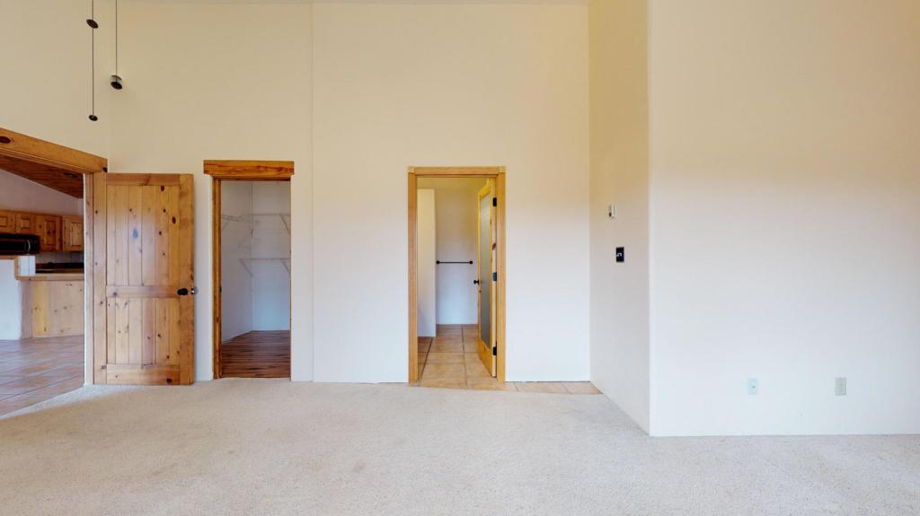 This lovely cabin is a classic Northern New Mexican ranch style home. The home itself is full of charm, natural light, and amazing views! It is designed with Rastra construction. Rastra is insulating concrete forms. It is both economically and environmentally friendly. It keeps the house warmer in the winters and cooler in the summers. Some of my favorite features about this home include the nearly five acres of land that come with it, the courtyard and patios, natural wood touches, and open layout. Let’s look inside!