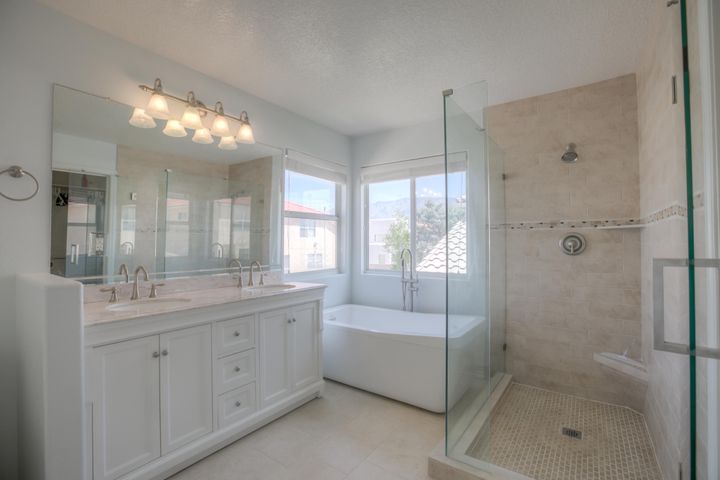 All three bathrooms have been recently updated with the Master or Primary bathroom being my favorite. Not only because it is an en suite, but because of the gorgeous soaking tub that looks out towards the Sandias. If you aren’t one for a good soak, there is a lovely standalone shower to make your heart sing.